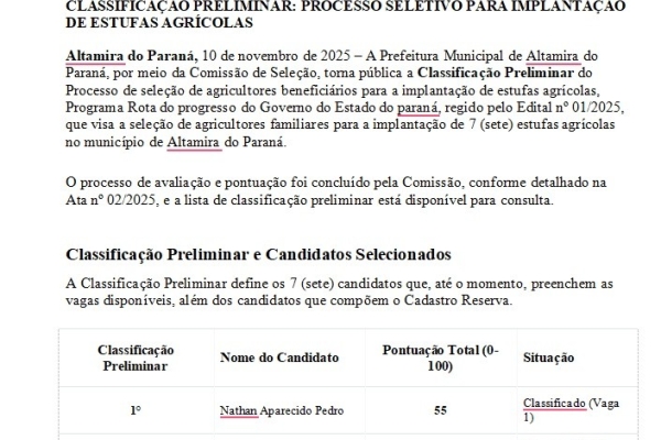 Prefeitura de Altamira do Paraná abre processo seletivo para 9 vagas