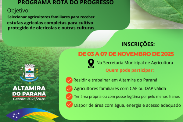 Prefeitura abre edital para Chamada Pública para Agricultores Familiares no Programa Rota do Progresso com implantação de estufa agrícola