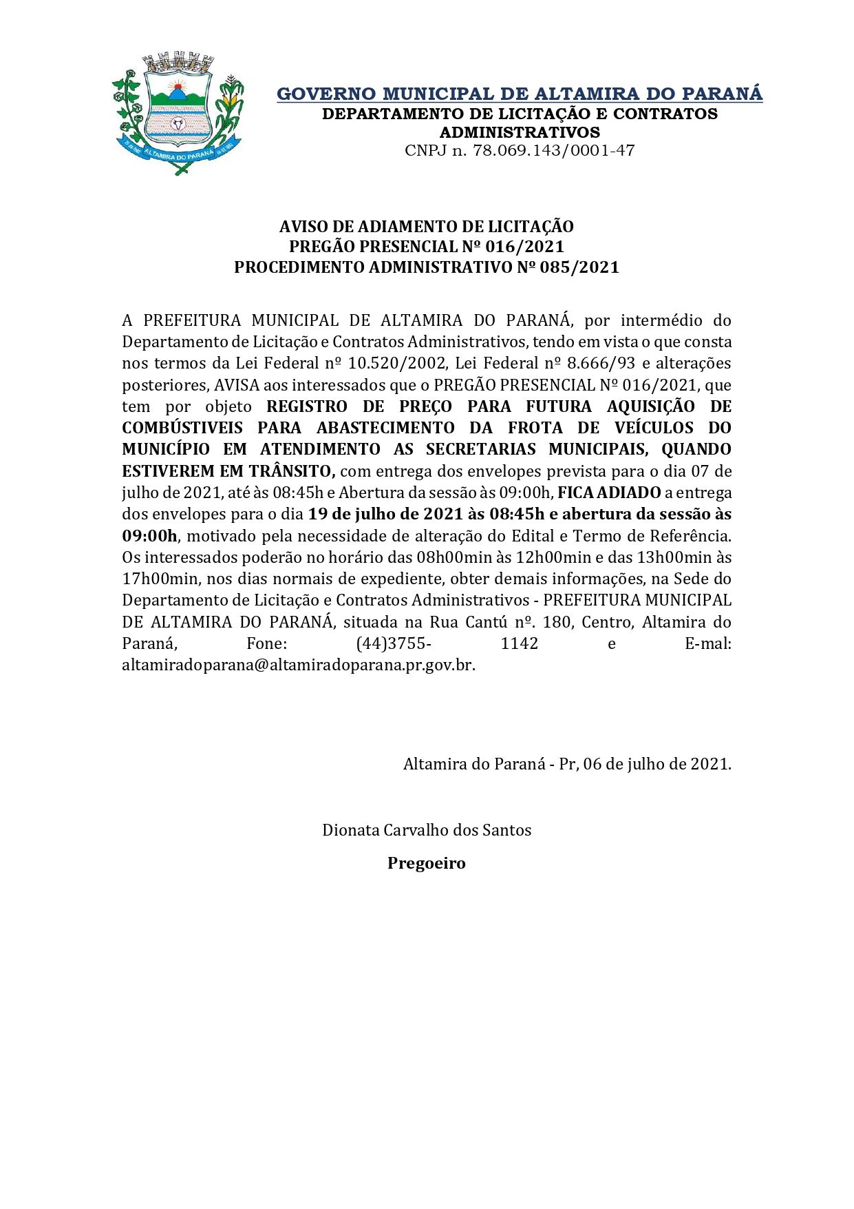 AVISO DE ADIAMENTO DE LICITAÇÃO PREGÃO PRESENCIAL Nº 016/2021 PROCEDIMENTO ADMINISTRATIVO Nº 085/2021