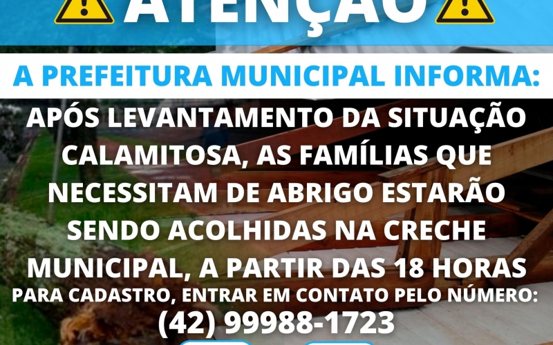 Após levantamento da situação calamitosa, as famílias que necessitam de abrigo estarão sendo acolhidas na Creche Municipal, a partir das 18 horas.