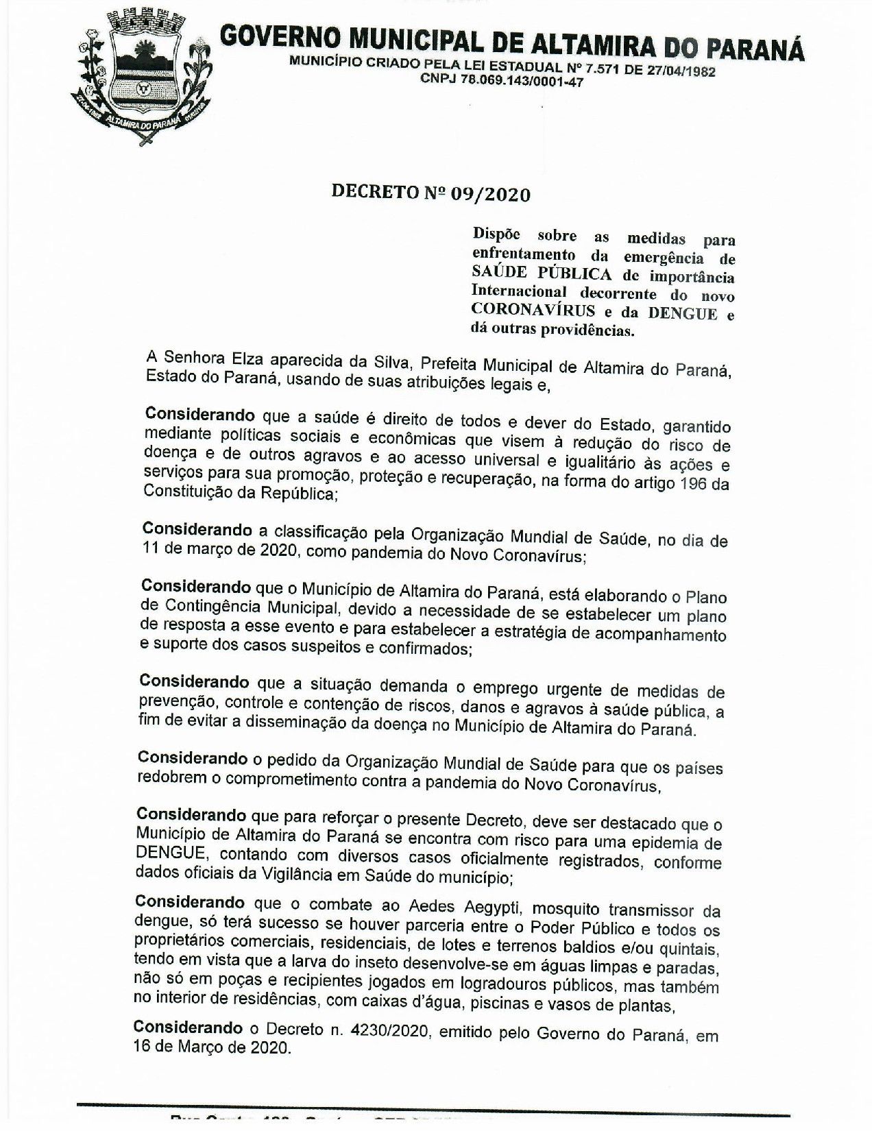 Com relação as medidas para enfrentamento do novo coranavírus, ficam suspensos em Altamira do Paraná por prazo indeterminado eventos de qualquer natureza com público superior a 50 pessoas, atividades educacionais, serviços de convivência e fortalecimento de vínculos, grupo de idosos, eventos esportivos e religiosos promovidos pelo município, viagens oficiais a serviços e cursos. O transporte sanitário para fora do município em casos de atendimentos eletivos, mantidos apenas o transporte de urgência e emergência para tratamento de alta complexidade, hemodiálise, gestação de risco e a critério da secretaria de saúde.