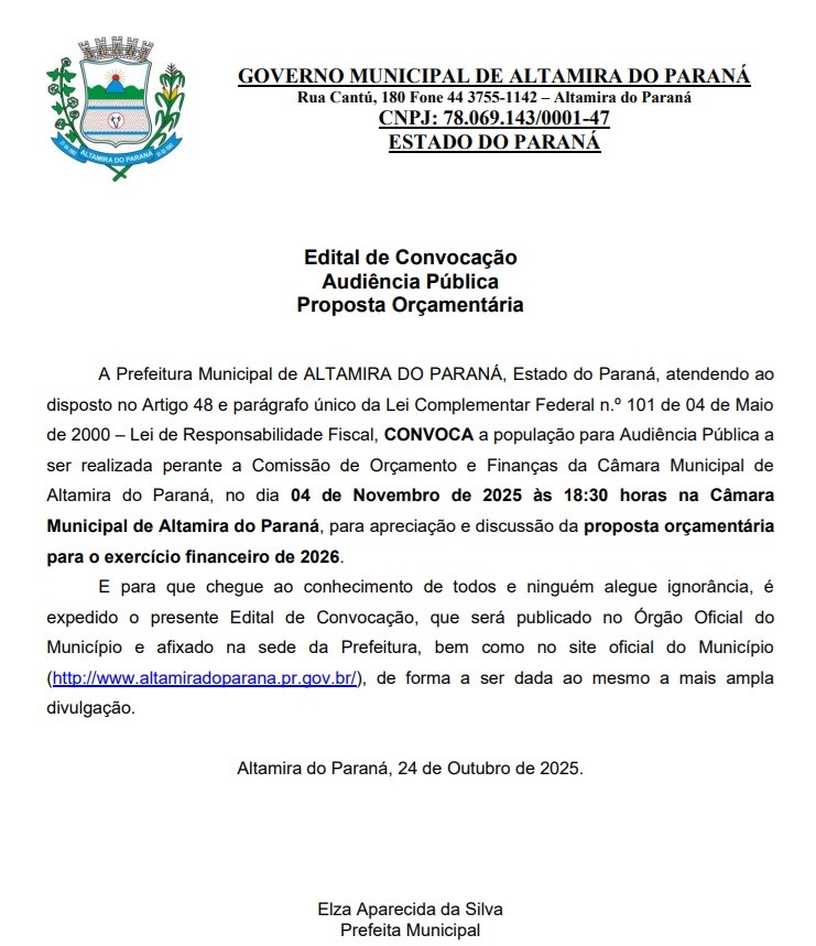 A Prefeitura Municipal de ALTAMIRA DO PARANÁ, Estado do Paraná, atendendo ao disposto no Artigo 48 e parágrafo único da Lei Complementar Federal n.º 101 de 04 de Maio de 2000 – Lei de Responsabilidade Fiscal, CONVOCA a população para Audiência Pública a ser realizada perante a Comissão de Orçamento e Finanças da Câmara Municipal de Altamira do Paraná, no dia 04 de Novembro de 2025 às 18:30 horas na Câmara Municipal de Altamira do Paraná, para apreciação e discussão da proposta orçamentária para o exercício financeiro de 2026. E para que chegue ao conhecimento de todos e ninguém alegue ignorância, é expedido o presente Edital de Convocação, que será publicado no Órgão Oficial do Município e afixado na sede da Prefeitura, bem como no site oficial do Município (http://www.altamiradoparana.pr.gov.br/), de forma a ser dada ao mesmo a mais ampla divulgação.