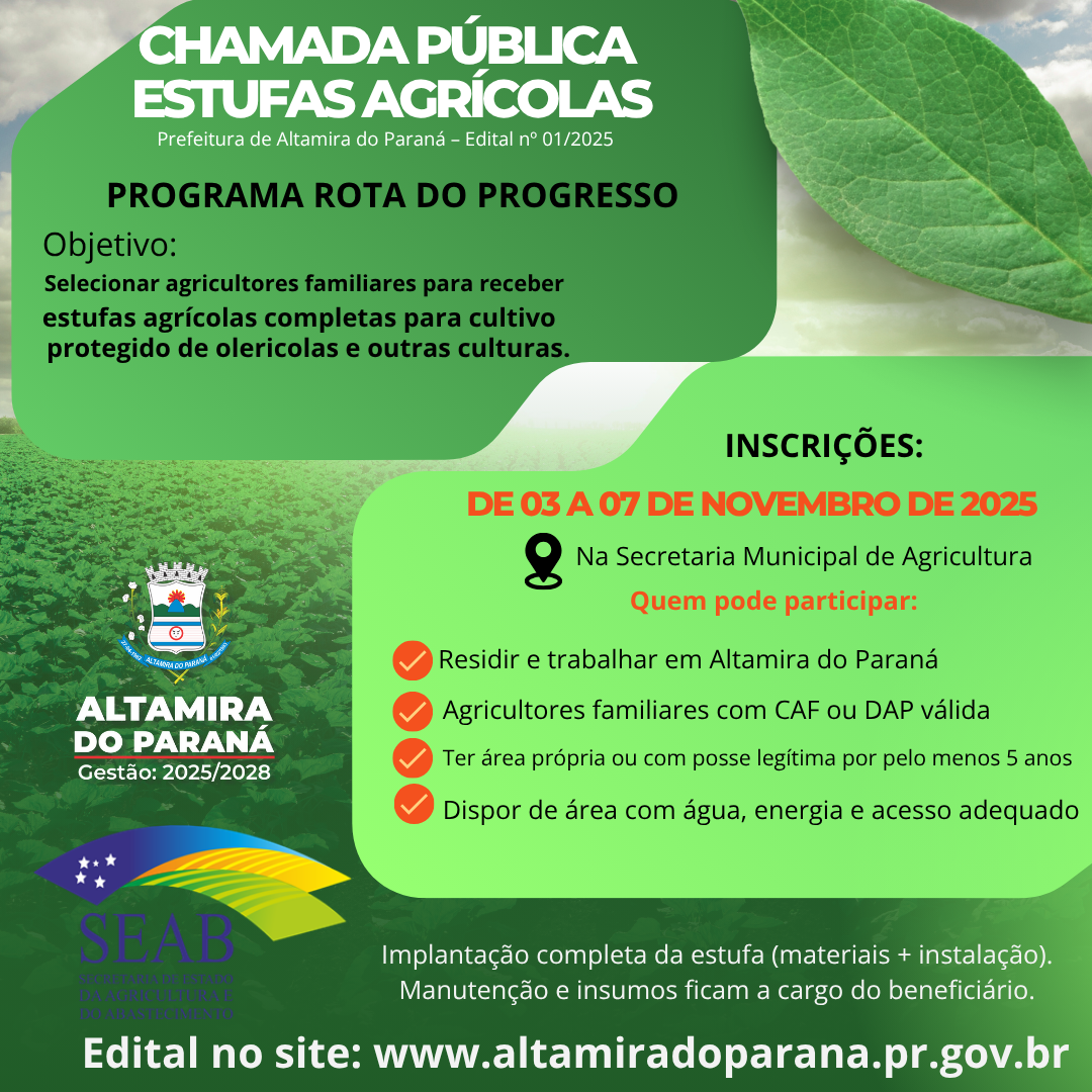 A Prefeitura de Altamira do Paraná, por meio da Secretaria da Agricultura, Meio Ambiente e Recursos Hídricos, publicou edital para Chamada Pública para agricultores familiares locais interessados no Programa Rota do Progresso com objetivo de selecionar agricultores familiares para receber 07 estufas agrícolas completas para cultivo protegido de olericolas e outras culturas.
