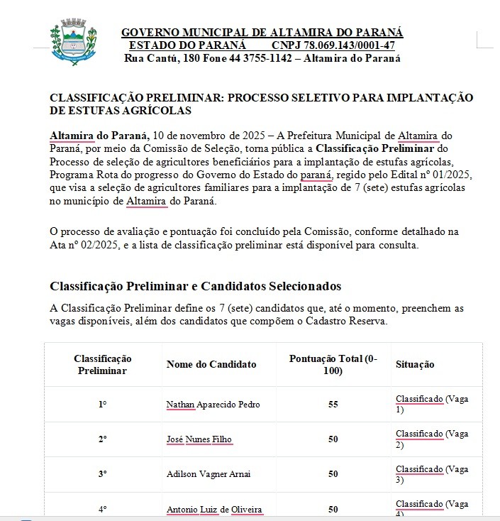 Altamira do Paraná, 10 de novembro de 2025 – A Prefeitura Municipal de Altamira do Paraná, por meio da Comissão de Seleção, torna pública a Classificação Preliminar do Processo de seleção de agricultores beneficiários para a implantação de estufas agrícolas, Programa Rota do progresso do Governo do Estado do paraná, regido pelo Edital nº 01/2025, que visa a seleção de agricultores familiares para a implantação de 7 (sete) estufas agrícolas no município de Altamira do Paraná.