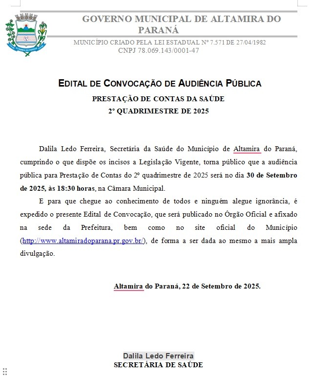 Dalila Ledo Ferreira, Secretária da Saúde do Município de Altamira do Paraná, cumprindo o que dispõe os incisos a Legislação Vigente, torna público que a audiência pública para Prestação de Contas do 2º quadrimestre de 2025 será no dia 30 de Setembro de 2025, às 18:30 horas, na Câmara Municipal.