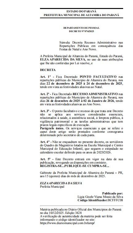 A Prefeita Municipal de Altamira do Paraná, Estado do Paraná,
